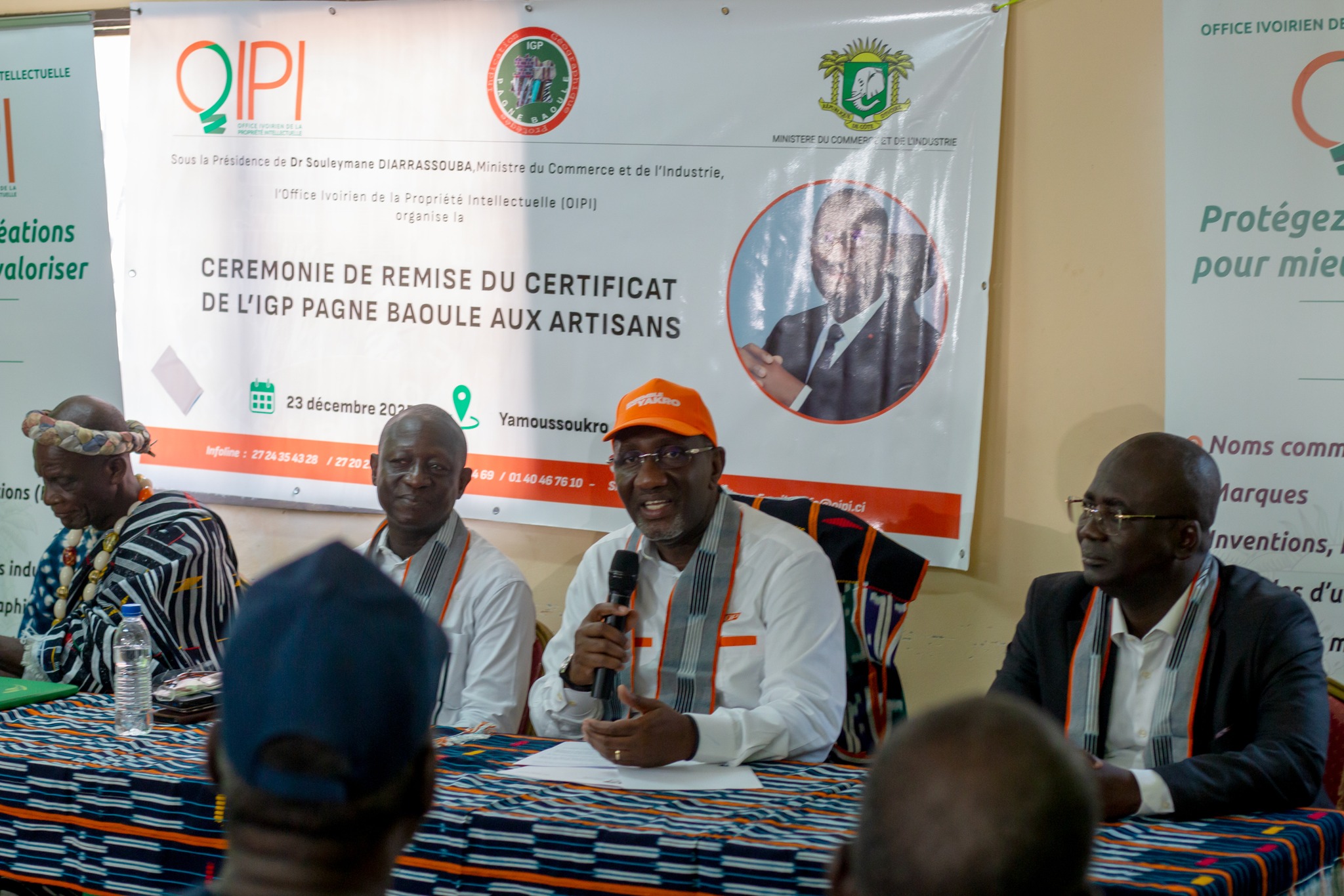 Le Ministre du Commerce et de l’Industrie, Dr. Souleymane Diarrassouba, a procédé, ce mardi 23 décembre 2025 à Yamoussoukro, à la remise officielle du certificat d’enregistrement en Indication Géographique Protégée (IGP) du Pagne Baoulé aux artisans. Cette cérémonie, riche en émotions a enregistré, la présence d’une forte délégation de l’Office Ivoirien de la Propriété Intellectuelle (OIPI), de la Secrétaire Générale de la Préfecture, représentant le Préfet de Région de Yamoussoukro, des Directions régionales et départementales du Commerce et de l’Industrie, de la Culture, du Tourisme, de la chefferie traditionnelle et des artisans du pagne Baoulé.